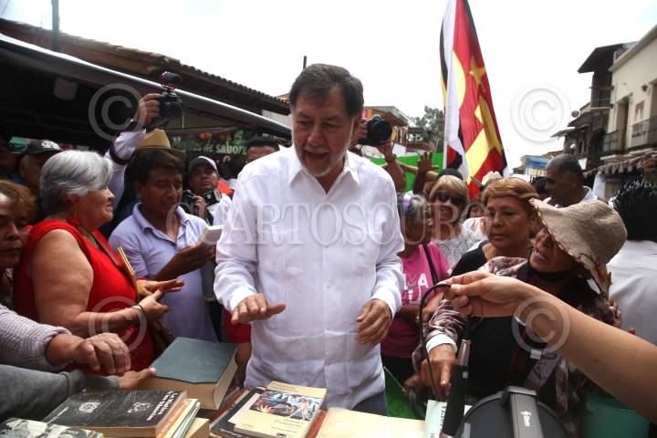 El aspirante a Coordinador Nacional de los Comités de Defensa de la Cuarta Transformación, Gerardo Fernández Noroña, regala libros a simpatizantes en Tepoztlán, Morelos.