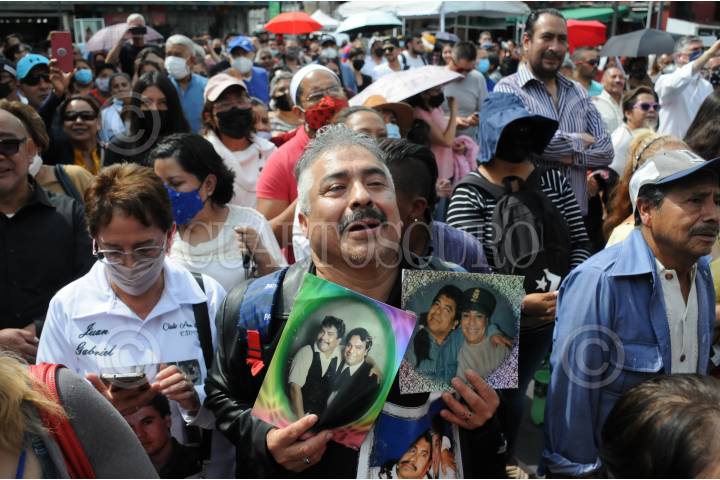 Un seguidor de Juan Gabriel llevó sus fotografías que se tomó junto al cantante mexicano al homenaje en Garibaldi.