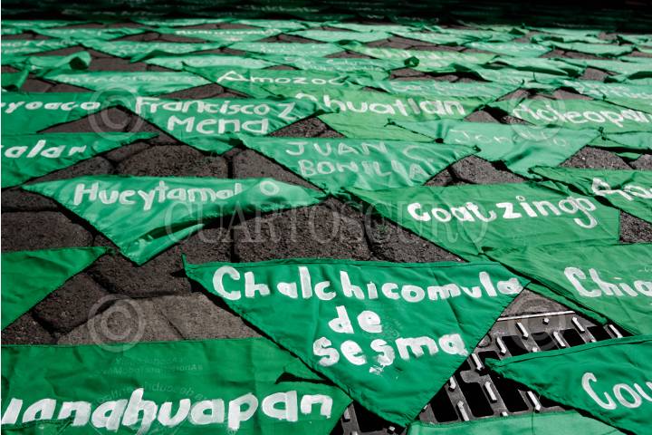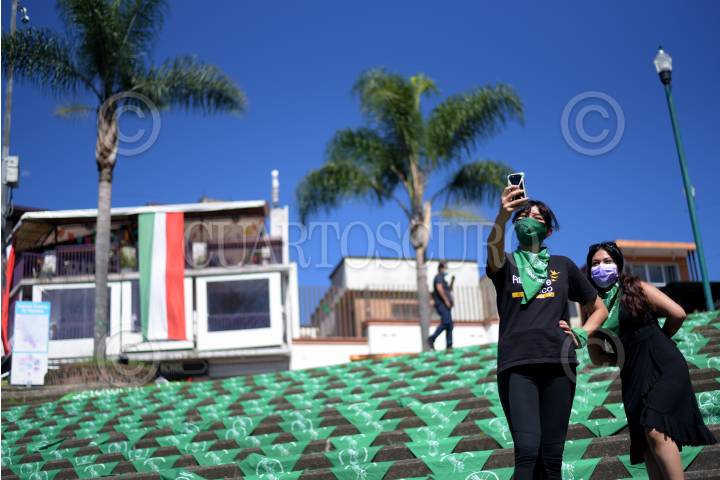 Feministas colocaron pañuelos verdes sobre las escalinatas del Paseo de los Lagos para exigirle al gobierno de Veracruz que haga efectiva la reforma del código penal que permite la Interrupción Legal del Embarazo (ILE).