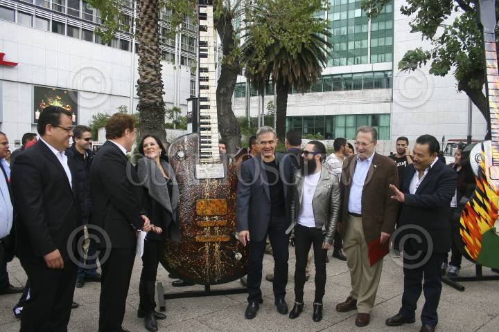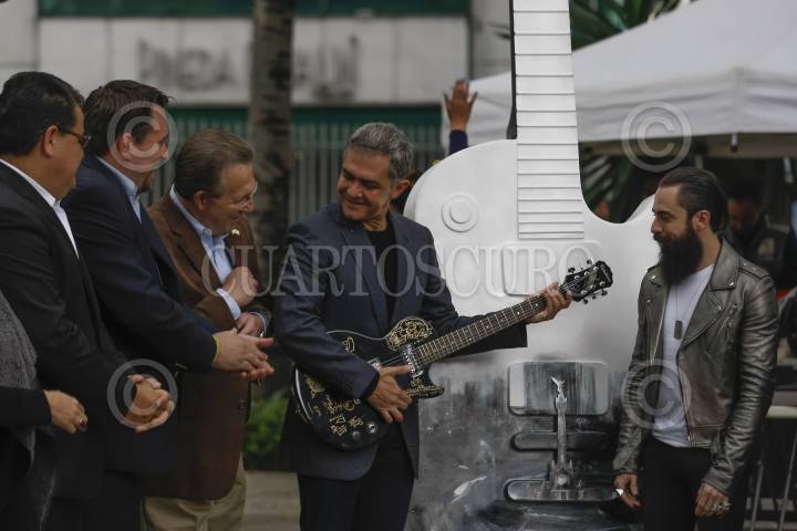 MÉXICO, D.F., 19OCTUBRE2014.- Miguel Ángel Mancera, Jefe de Gobierno del Distrito Federal, encabezo la inauguración Guitar Town Ciudad de México 2014, la exposición cuenta con guitarras Les Paul (Gibson) de 3 metros de altura hechas de fibra de vidrio que fueron intervenidas y pintadas por artistas urbanos y músicos. Durante la inauguración fue acompañado de Anthony Wayne; embajador de Estados Unidos en México, Héctor Serrano Cortés, secretario de Gobierno del DF, Jay de la Cueva de la agrupación Moderatto; y Robert Treviño, embajador de Guitar Town Ciudad de México. FOTO: GUILLERMO PEREA /CUARTOSCURO.COM