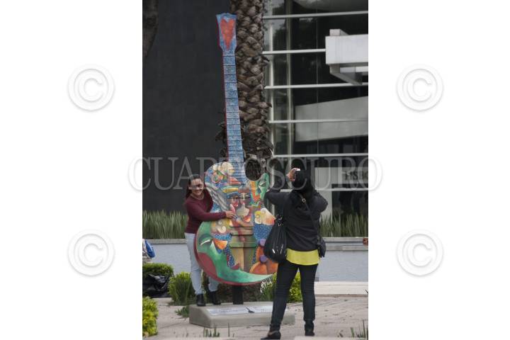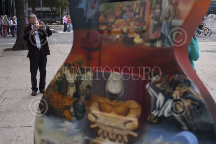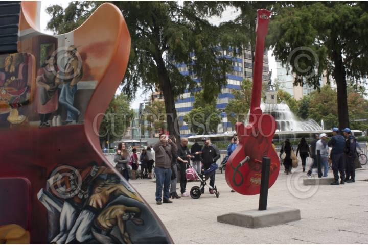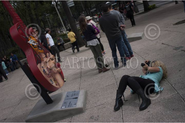 MÉXICO, D.F., 19OCTUBRE2014.- Paseantes y curiosos recorren la exposición Guitar Town Ciudad de México 2014, donde guitarras Les Paul (Gibson) de 3 metros de altura hechas de fibra de vidrio que fueron intervenidas y pintadas por artistas urbanos y músicos. La exposición podrá ser visitada a partir de hoy hasta el próximo 30 de noviembre en avenida Reforma en el corredor de que va del Ángel de la Independencia a la fuente de la Diana Cazadora. FOTO: GUILLERMO PEREA /CUARTOSCURO.COM