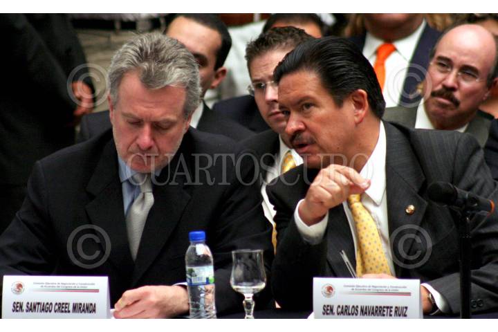 MÉXICO, D.F., 25ABRIL2007.- Los líderes de las bancadas del PAN y PRI en Senado, Santiago Creel y Carlos Navarrete, respectivamente, durante la instalación de la Comisión para la Reforma del Estado. FOTO: ISAAC ESQUIVEL/CUARTOSCURO.COM