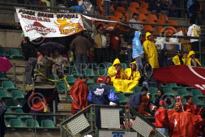 MÉXICO D.F. 23MARZO2006.- A pesar de que la lluvia detuvó por unos instantes el juego de beisbol entre los Diablos Rojos y los Tigres, los aficionados esperaron en las truibunas del Foro Sol, para ver la victoria de los Diablos. FOTO: Diego Gallegos/CUARTOSCURO.COM
