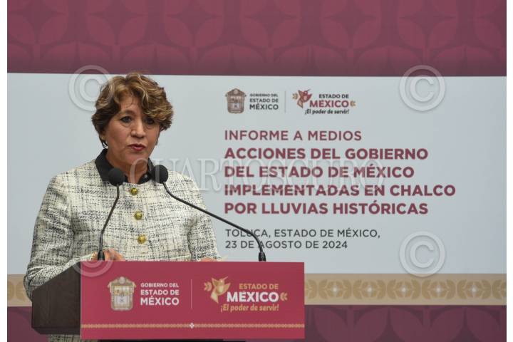 TOLUCA, ESTADO DE MÉXICO, 23AGOSTO2024.- Delfina Gómez Álvarez, gobernadora del Estado de México acompañada por José Miguel Gutiérrez Morales, Presidente Municipal de Chalco, durante el informe a medios de las Acciones del Gobierno estatal implementada en Chalco a 21 día de las inundaciones que se registran en la colonias San Miguel Jacalones y Culturas de México. FOTO: CRISANTA ESPINOSA AGUILAR /CUARTOSCURO.COM