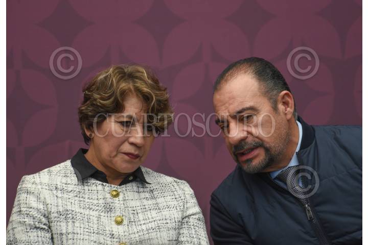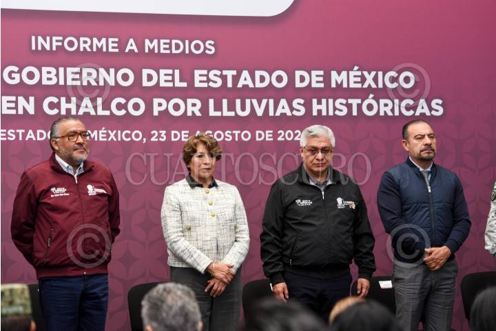 TOLUCA, ESTADO DE MÉXICO, 23AGOSTO2024.- Delfina Gómez Álvarez, gobernadora del Estado de México acompañada por Cristóbal Castañeda, Secretario de Seguridad Estatal, Horacio Duarte, Secretario General de Gobierno, José Miguel Gutiérrez Morales, Presidente Municipal de Chalco, durante el informe a medios de las Acciones del Gobierno estatal implementada en Chalco a 21 día de las inundaciones que se registran en la colonias San Miguel Jacalones y Culturas de México. FOTO: CRISANTA ESPINOSA AGUILAR /CUARTOSCURO.COM