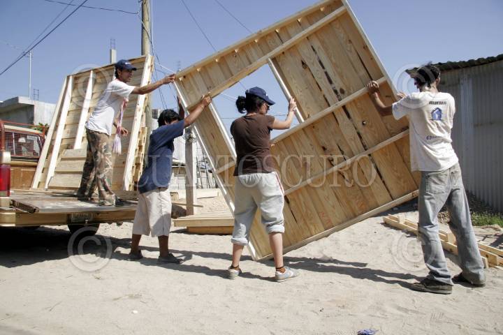 VILLAHERMOSA, TABASCO, 31ENERO2008.- Voluntarios altruistas latinoamericanos de “Un Techo para mi País” continuan con los trabajos de construcción de casas dignas desde esta mañana para Chocos que resultaron afectados en las pasadas inundaciones. En la imagen los jóvenes estudiantes bajan el material cien por ciento de madera con la que fabrican las casas a una familia que salio beneficiada en la colonia Asunción Castellanos. FOTO: MARCO POLO GUZMÁN HERNÁNDEZ/CUARTOSCURO.COM