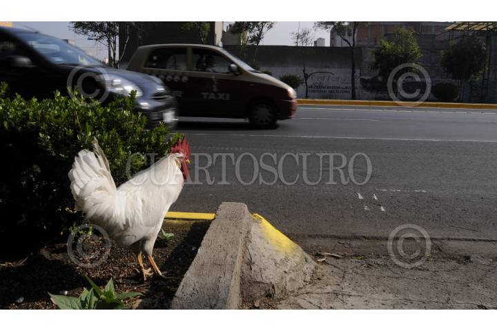 MÉXICO, D.F., 30MARZO2012.- Un gallo solitario pasea en calles de la capital. El animal comúnmente esta en granjas o vive en cautiverio, en cambio el ave decidió cambiar de contexto habitando la ciudad acorralado en la contaminación y tráfico vehicular. FOTO: DIEGO SIMÓN SÁNCHEZ /CUARTOSCURO.COM