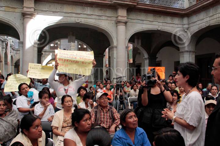 OAXACA, OAXACA, 03DICIEMBRE2009.-En el marco del día mundial de la discapacidad, el gobierno del estado firmó un pacto de colaboración con el sistema de salud y entregó simbólicamente sillas de ruedas y bastones en el museo del palacio, donde poco antes de terminar 10 personas familiares de niños especiales se alzaron con pancartas exigiendo atención a zonas marginadas y albergues que necesitan recursos; la presidente honoraria del sistema DIF estatal y esposa del gobernador Lourdes Salinas de Ruiz, calmó los ánimos prometiendo revisar todos los caso. FOTO: MAX NÚÑEZ/CUARTOSCURO.COM
