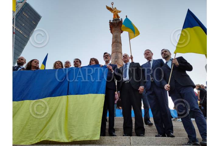 Los embajadores en México: Päivi Marianne Pohjanheimo (Finlandia); Juan Duarte Cuadrado (España); Oksana Dramaretska (Ucrania); Marco Tulio Chicas Sosa (Guatemala), y Graeme C. Clark (Canadá) , durante la concentración en el Ángel de la Independencia por "la defensa de la libertad y la democracia en Ucrania" a un año de que comenzó la invasión militar de Rusia en Ucrania.