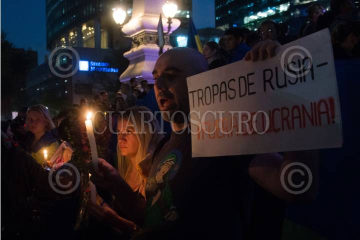 Ucranianos y rusos residentes en México, durante la concentración en el Ángel de la Independencia por "la defensa de la libertad y la democracia en Ucrania" a un año de que comenzó la invasión militar de Rusia en Ucrania.