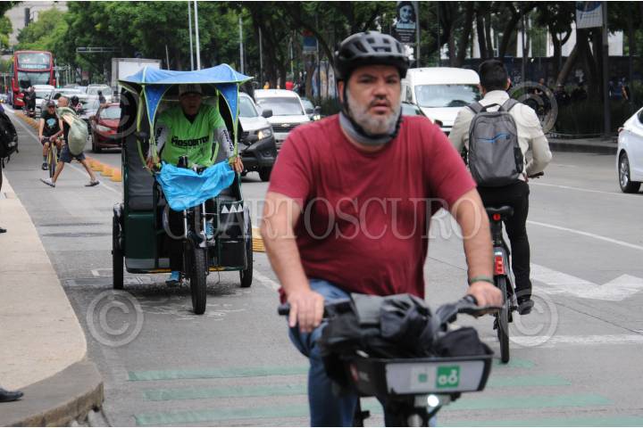 CIUDAD DE MÉXICO, 10JULIO2024. - Los ciclistas se han quejado de que vehículos como los ciclotaxis y motonetas invaden el área de la ciclopista. FOTO: DANIEL AUGUSTO /CUARTOSCURO.COM