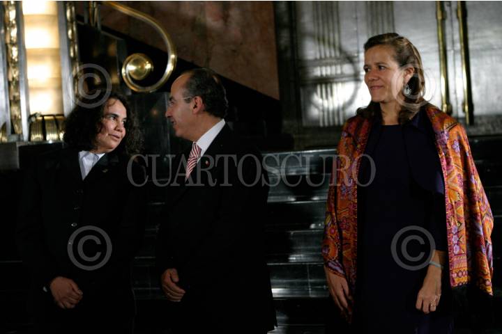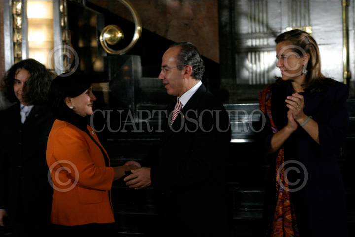 MÉXICO, D.F. 03DICIEMBRE2009.-Consuelo Saízar, presidenta del Consejo Nacional para la Cultura y las Artes (CONACULTA); Amalia García Medina, gobernadora del Estado de Zacatecas; Felipe de Jesús Calderón Hinojosa, presidente de México; y Margarita Zavala de Calderón, presidenta nacional del DIF estuvieron presentes en la inauguración de la exposición de Manuel Felguérez en el Palacio de las Bellas Artes. FOTO: IVÁN STEPHENS/CUARTOSCURO.COM