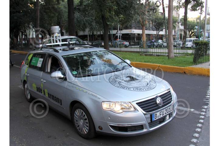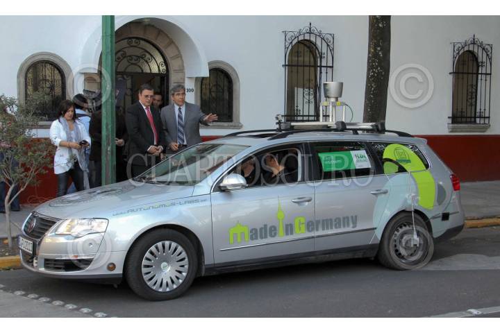 MÉXICO, D.F., 05OCTUBRE2012.- Marcelo Ebrard Casaubon, jefe de Gobierno del Distrito Federal, recibió al doctor Raúl Rojas, de la Universidad libre de Berlín, Alemania, quien le presentó su invento: un vehículo de conducción autónoma. FOTO: CUARTOSCURO.COM