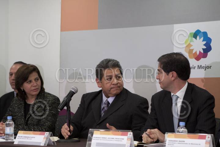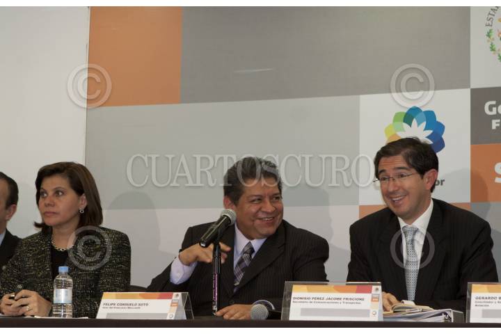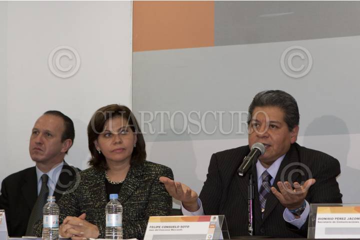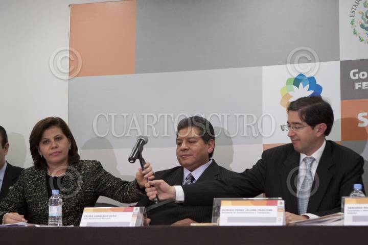 MÉXICO, D.F., 24FEBRERO2012.- Rosalinda Velez Juárez, secretaria del Trabajo y Previsión y Social, Felipe Consuelo, juez rector del concurso mercantil de Mexicana, y Dionisio Pérez-Jácome, secretario de Comunicaciones y Transportes, durante el anuncio de que la empresa Mexicana será recapitalizada a través de una inversión directa de la empresa Med Atlantica, con esto se supera el año y medio de paro de actividades de esta empresa aérea. FOTO: MOISÉS PABLO /CUARTOSCURO.COM