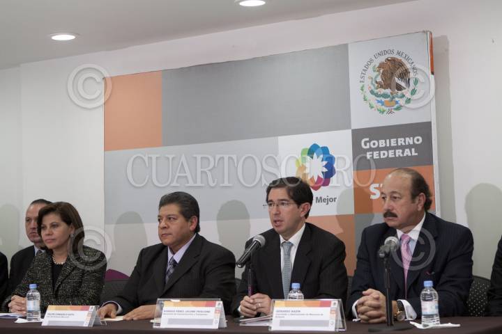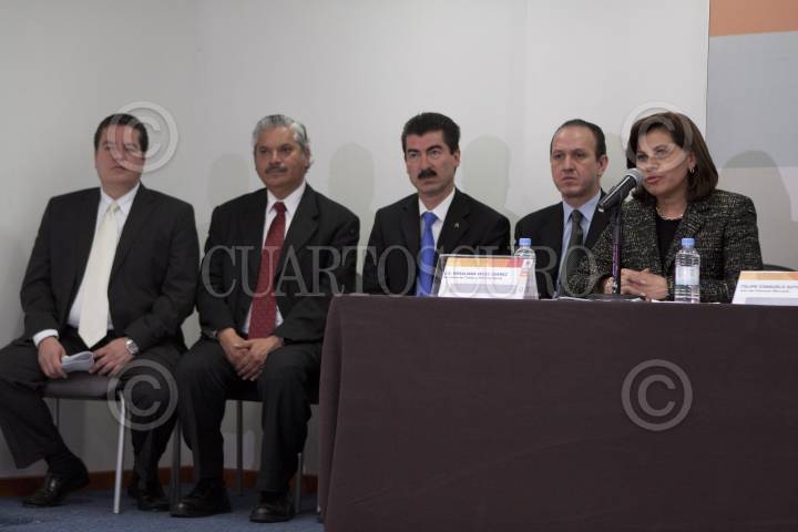 MÉXICO, D.F., 24FEBRERO2012.- Fernando Perfecto, líder sindical de los pilotos, Rosalinda Velez Juárez, secretaria del Trabajo y Previsión y Social, Felipe Conseulo, juez rector del concurso mercantil de Mexicana, Dionisio Pérez-Jácome, secretario de Comunicaciones y Transportes, y Gerardo Badin, mediador en el proceso, durante el anuncio de que la empresa Mexicana será recapitalizada a través de una inversión directa de la empresa Med Atlantica, con esto se supera el año y medio de paro de actividades de esta empresa aérea. FOTO: MOISÉS PABLO/CUARTOSCURO.COM
