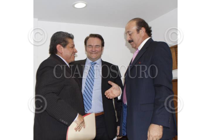 MÉXICO, D.F., 24FEBRERO2012.- Dionisio Pérez-Jácome, secretario de Comunicaciones y Transportes, Gerardo Badin, medidador en el proceso, y Christian Cadenas, accionista de Med Atlantica, durante el anuncio de que la empresa Mexicana será recapitalizada a través de una inversión directa de la empresa Med Atlantica, con esto se supera el año y medio de paro de actividades de esta empresa aérea. FOTO: MOISÉS PABLO /CUARTOSCURO.COM