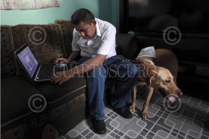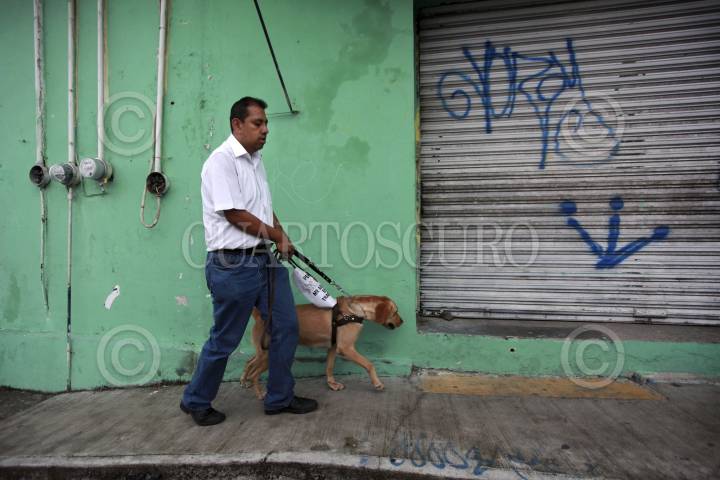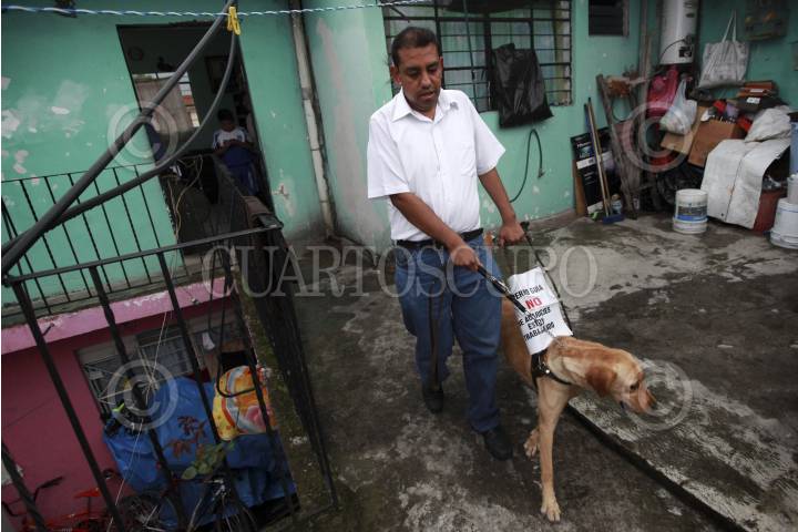 ORIZABA, VERACRUZ., 09JUNIO2014.- Iván y su perrita Daysi conviven en una humilde casa de la ciudad de Orizaba. Él es instructor, líder y motivador de un grupo de debiles visuales de la región. Ella es un perro guía adiestrado minuciosamente para acompañar a Iván durante todos sus traslados. Ambos personajes saltaron a la luz pública en un video donde se muestra a un elemento de seguridad de la clínica del IMSS No. 6 agrediendo a Iván Cortés Gómez por intentar entrar al edificio de salud con su lazarillo. En México la falta de cultura entre las autoridades y la sociedad ha provocado hechos de discriminación a las personas con capacidades diferentes. FOTO: FÉLIX MÁRQUEZ / CUARTOSCURO.COM