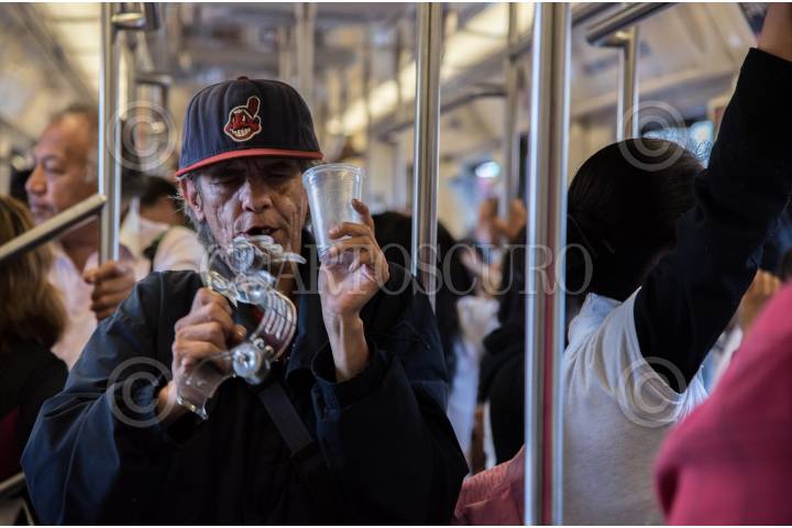 CIUDAD DE MÉXICO, 25MARZO2017.- Un señor invidente hace música con un pandero a cambio de unas monedas en la línea 1 del metro. FOTO: TERCERO DÍAZ /CUARTOSCURO.COM
