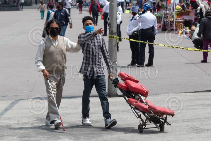 Un hombre invidente que ofrece masajes en las calles del Centro Histórico se dirige a su sitio de trabajo.