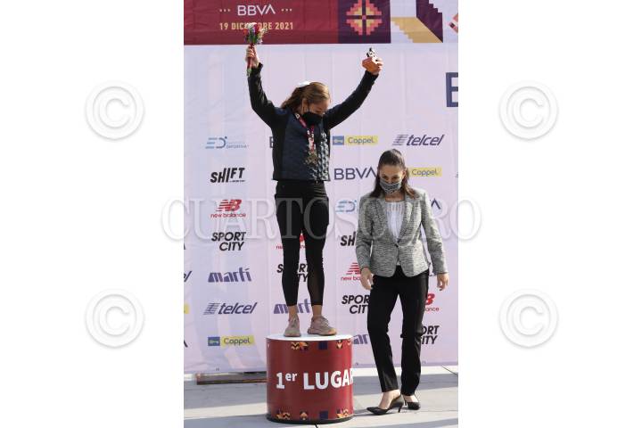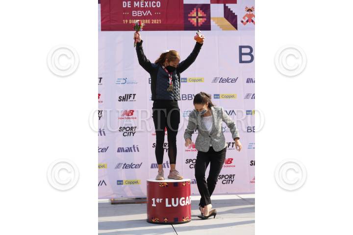 Monica Olivia Rodríguez ganadora del primer lugar en la categoría invidente a femenil junto a la Jefa de gobierno Claudia Sheinbaum en la ceremonia de premiación del Medio Maratón de la Ciudad de México 2021.