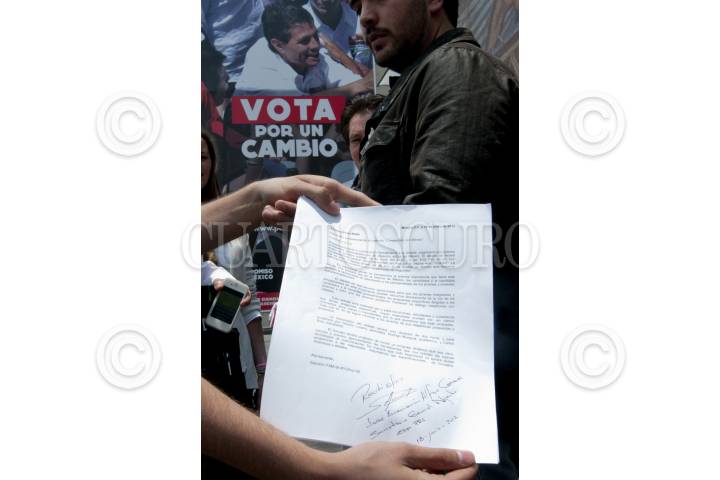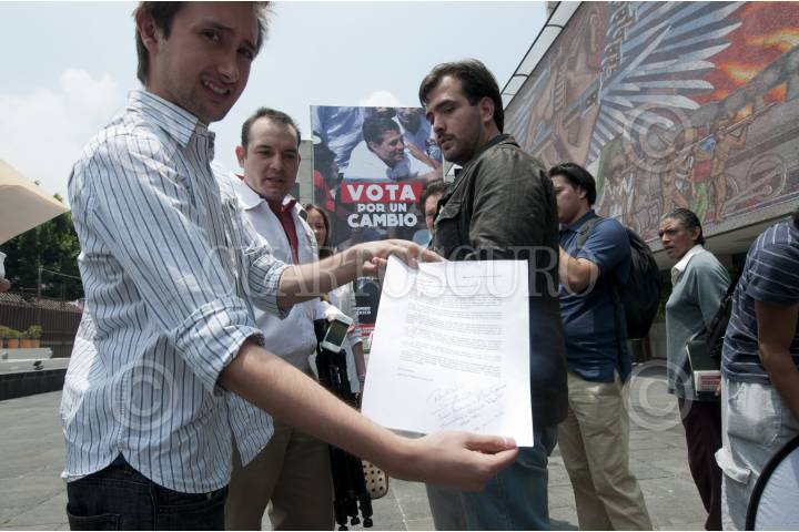 MÉXICO, D.F. 18JULIO2012.- Integrantes del #Yosoy132, acudieron a las instalaciones del Comité Ejecutivo Nacional del PRI, donde entregaron la invitación para que asista al debate el candidato a la presidencia Enrique Peña Nieto. FOTO: CUARTOSCURO.COM