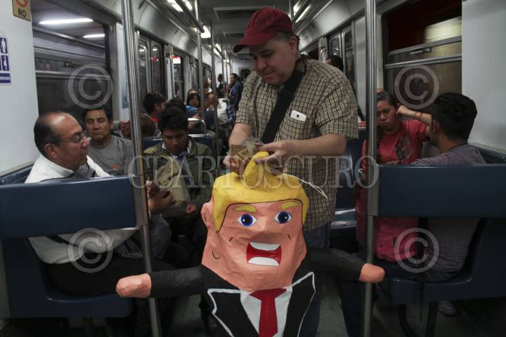 CIUDAD DE MÉXICO, 26DICIEMBRE2016.- El periodista Federico Campbell repartió propaganda a usuarios del Metro para que asistan este próximo 20 de enero, al Ángel de la Independencia a una tocada de rock que se realizara en contra del presidente electo de los Estados Unidos Donald Trump. FOTO: ANTONIO CRUZ /CUARTOSCURO.COM