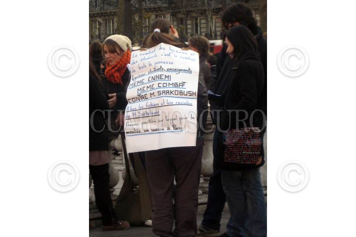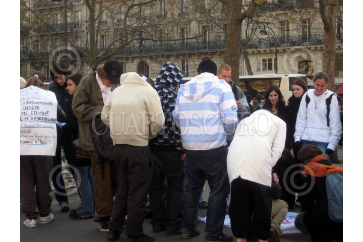 PARIS, FRANCIA., 28NOVIEMBRE2007.- Aspecto de una de las múltiples manifestaciónes que se han susitado entre jóvenes que se protestan en contra del presidente de la república francesa Nicolás Sarkosy. Estos disturbios que se vienen aconteciendo en algunos barrios periféricos de París, comenzaron con la muerte de dos adolescentes el pasado domingo en un accidente donde estuvieron involucrados elementos de la policía parisina. FOTO: MARIA VALTIERRA/CUARTOSCURO.COM