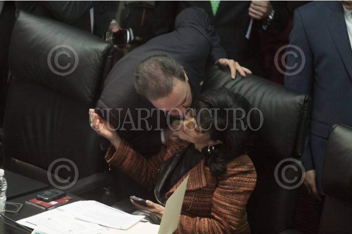 MÉXICO, D.F., 05FEBRERO2013.- El coordinador Emilio Gamboa Patrón, saluda a su compañera tricolor María Lucero Saldaña, en la sesión en la Cámara Alta. FOTO: MOISÉS PABLO /CUARTOSCURO.COM