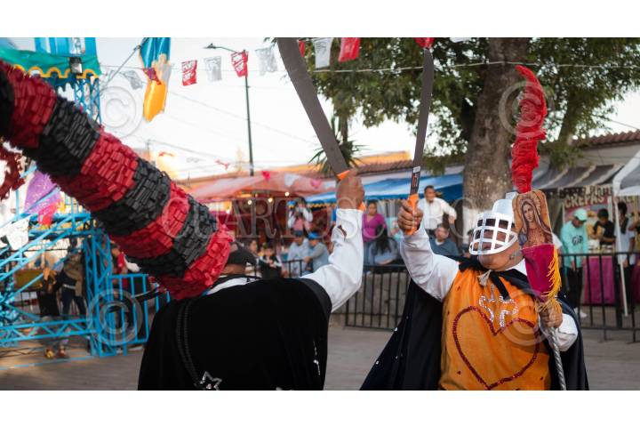 TLAXCALA, TLAXCALA, 23ENERO2025.- Los "mahomas" de San Juan Totolac son una tradición cultural y religiosa que se lleva a cabo en este municipio del estado de Tlaxcala. La palabra "mahoma" se refiere a una figura o representación de Mahoma, el profeta del Islam, que se utiliza en una danza tradicional que se realiza durante la fiesta patronal de San Juan Totolac. La danza es una representación teatral que cuenta la historia de la lucha entre los cristianos y los musulmanes durante la Reconquista española en la que los participantes se visten con trajes, máscaras coloridas y realizan bromas al público a cambion de alguna moneda. FOTO: ALAIN HERNÁNDEZ/CUARTOSCURO.COM