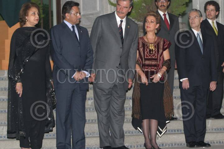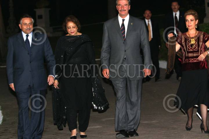 MEXICO, D.F. 02DICIEMBRE2004.- Pervez Musharraf, presidente de la república Islámica de Pakistan y su esposa Sehba Musharraf junto con el Presidente de México, Vicente Fox Quesada y su esposa Marta Sahagún a su llegada a la residencia oficial de los Pinos. FOTO:Eunice Adorno_CUARTOSCURO.COM