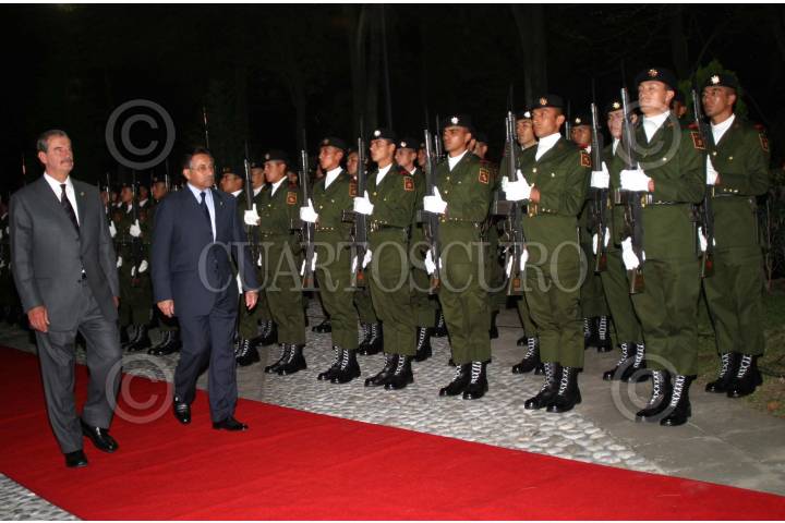 MEXICO, D.F. 02DICIEMBRE2004.- Pervez Musharraf, presidente de la república islàmica de Pakistan junto con el Presidente de México, Vicente Fox Quesada hace la revista a la guardia de honor durante la ceremonia oficial de bienvenida. FOTO:Eunice Adorno/CUARTOSCURO.COM