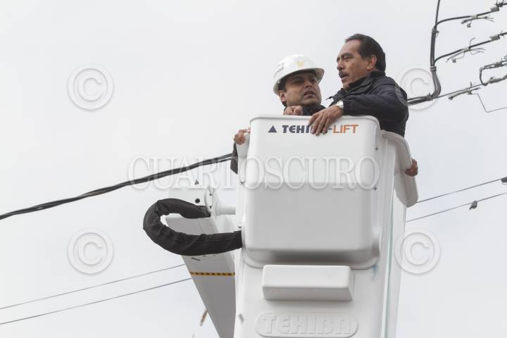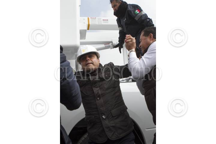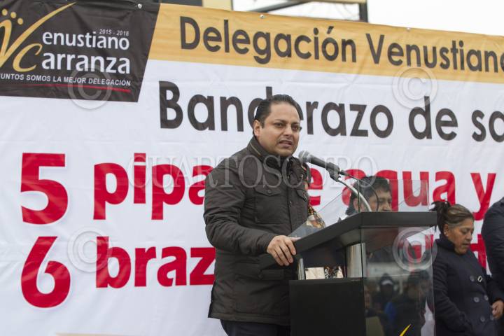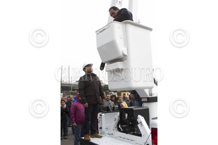 MÉXICO, D.F., 28ENERO2016.- El delegado de Venustiano Carranza Israel Moreno dió al banderazo de salida de cinco pipas de agua y tres nuevas grúas con brazos mecánicos de 13 de metros de longirud con canastillas, en la explanada delegacional. El titular de la delegación aseguró que cuentan con 22 carros tanque apenas van a poder sastifacer la crisis de agua que se enfrentará por el corte del suministro por los trabajos en el Sistema Cutzamala. FOTO: MOISÉS PABLO /CUARTOSCURO.COM
