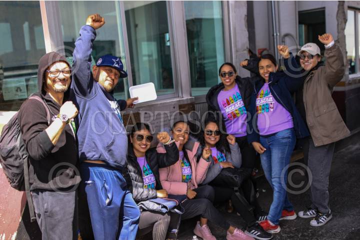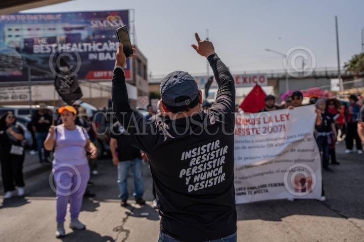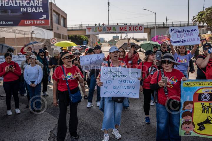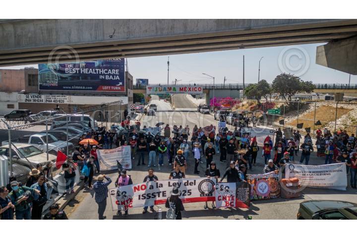 TIJUANA, BAJA CALIFORNIA, 2JUNIO2025.- Maestros con pancartas bloqueando el acceso vehicular a Tijuana por la garita del Chaparral. Maestros de la Coordinadora Nacional de Trabajadores de la Educación (CNTE) bloquearon esta mañana el carril de salida hacia México en la Garita El Chaparral, en Tijuana, como parte de una protesta para exigir mejores prestaciones laborales y la abrogación de la Ley del ISSSTE 2007. Gerónimo Castro, coordinador de la CNTE en Tijuana, explicó que eligieron este punto fronterizo para visibilizar internacionalmente su inconformidad con las reformas que eliminaron los beneficios previos a 2007 y obligaron a los nuevos docentes a cotizar en AFORES. A la protesta acudieron maestros de diversas regiones de Baja California. Según Édgar Lizárraga, secretario general de la D-188, el bloqueo es un llamado a la presidenta para que cumpla sus promesas de campaña. FOTO: CHRIS NOYOLA/ CUARTOSCURO.COM