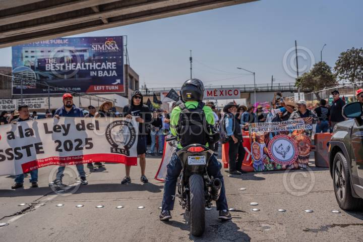 TIJUANA, BAJA CALIFORNIA, 2JUNIO2025.- Motociclista frente a la multitud de maestros en protesta. Maestros de la Coordinadora Nacional de Trabajadores de la Educación (CNTE) bloquearon esta mañana el carril de salida hacia México en la Garita El Chaparral, en Tijuana, como parte de una protesta para exigir mejores prestaciones laborales y la abrogación de la Ley del ISSSTE 2007. Gerónimo Castro, coordinador de la CNTE en Tijuana, explicó que eligieron este punto fronterizo para visibilizar internacionalmente su inconformidad con las reformas que eliminaron los beneficios previos a 2007 y obligaron a los nuevos docentes a cotizar en AFORES. A la protesta acudieron maestros de diversas regiones de Baja California. Según Édgar Lizárraga, secretario general de la D-188, el bloqueo es un llamado a la presidenta para que cumpla sus promesas de campaña. FOTO: CHRIS NOYOLA/ CUARTOSCURO.COM