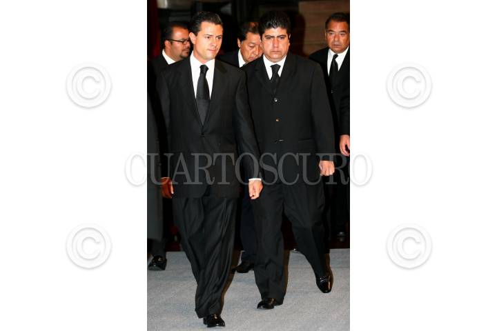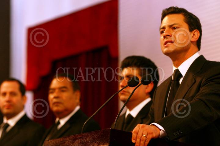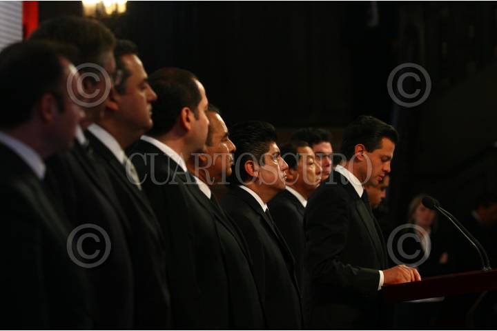 TOLUCA, ESTADO DE MÉXICO., 05OCTUBRE2008.- El gobernador del Estado de México Enrique Peña Nieto junto con representantes de partidos politicos y de los poderes ejecutivo, legislativos y judicial del estado, ofrecieron una conferencia de prensa para informar que se ocupara toda la fuerza publica para detener a los asesinos de Salvador Vergara Cruz, edil de Ixtapan de la Sal. Tambien hizo una invitacion a los presidentes municipales que denunciaen ante la procuraduria del estado si han sido victimas de amenazas. FOTO: SAÚL LÓPEZ/CUARTOSCURO.COM