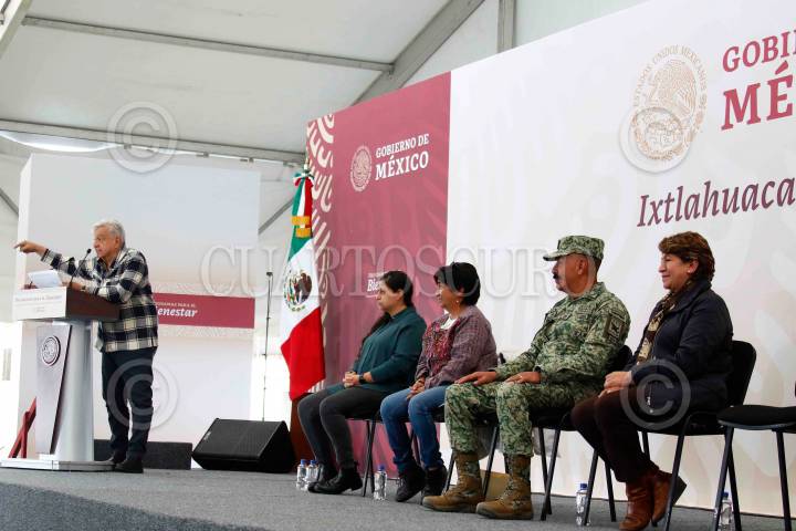 IXTLAHUACA, ESTADO DE MÉXICO, 08DICIEMBRE2023. Andrés Manuel López Obrador, presidente Constitucional de los Estados Unidos Mexicanos en evaluación Programas para el Bienestar en Ixtlahuaca. Lo acompañan Pamela López Ruiz, directora general del Programa “La Escuela es Nuestra”; Edna Elena Vega Rangel, subsecretaria de Ordenamiento Territorial y Agrario de la Secretaría de Desarrollo Agrario, Territorial y Urbano y responsable del “Programa de Vivienda”; Salvador Fernando Cervantes Loza, director general de Ingenieros de la Secretaría de la Defensa Nacional; Delfina Gómez Álvarez, gobernadora Constitucional del Estado de México; y Abuzeid Lozano Castañeda, presidente municipal de Ixtlahuaca. FOTO: PRESIDENCIA/CUARTOSCURO.COM