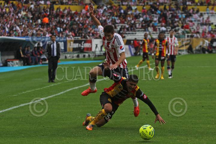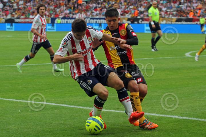 GUADALAJARA, JALISCO. 25ENERO2015.- El jugador de Chivas Isaac Brizuela y el jugador de Leones Negros, Jairo González disputan el balón, durante el partido entre Leones Negros de la Universidad de Guadalajara y las Chivas de Guadalajara en el Estadio Jalisco, en encuentro correspondiente a la Jornada 3 del Torneo Clausura 2015 de la Liga MX, en donde el marcador final fue de 1-1 FOTO: FERNANDO CARRANZA GARCIA/CUARTOSCURO.COM