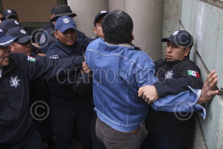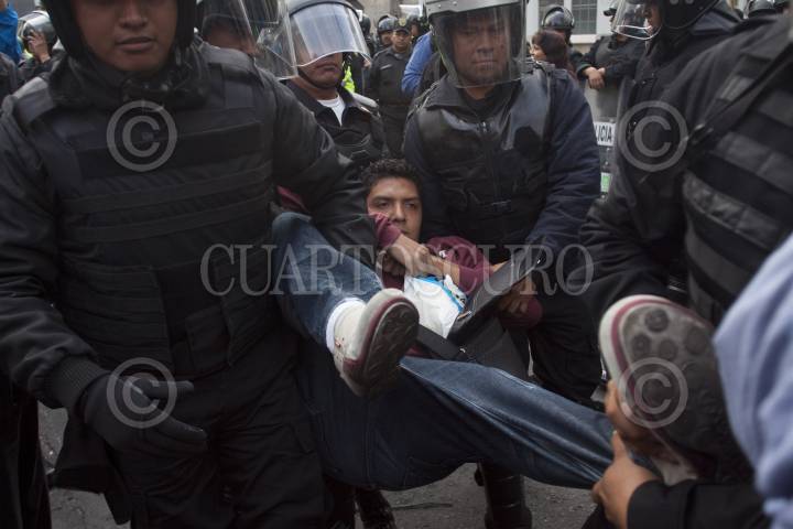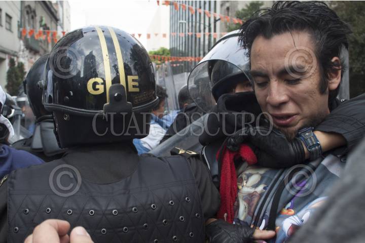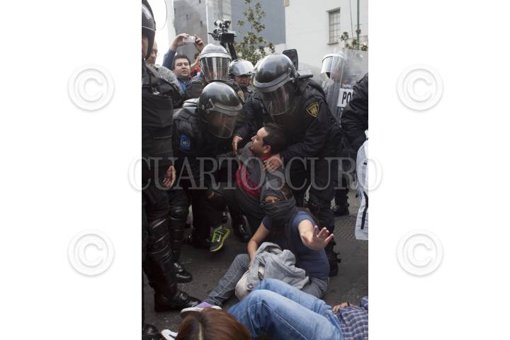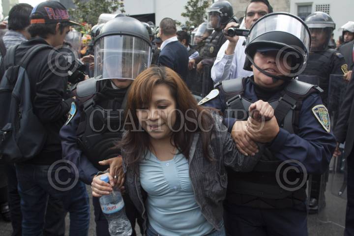 MÉXICO, D.F., 09OCTUBRE2012.- Opositores a la Reforma Laboral se manifestaron desde temprano afuera de las instalaciones del Senado, los manifestantes tratan de impedir el paso de los senadores y trabajadores a la sede senatorial, granaderos de la Secretaría de Seguridad Pública del DF han replegado y encapsulado a los protestantes. FOTO: MOISÉS PABLO /CUARTOSCURO.COM
