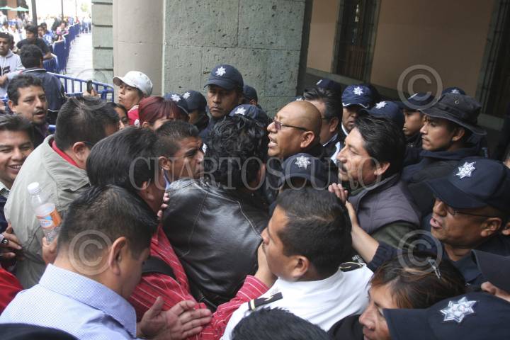 OAXACA, OAXACA, 02MARZO2013.- Maestros de la Sección 22 del SNTE protestaron en el exterior del Palacio de Gobierno en contra de la visita de Rosario Robles Berlanga, secretaria de Desarrollo Social (Sedesol), quien firmó con Gabino Cué, gobernador del Estado el Acuerdo Integral para el Desarrollo Social Incluyente con lo que dio inicio oficialmente la Cruzada Nacional Contra el Hambre, los mentores se jalonearon con policías estatales que resguardaban el inmueble. FOTO: ARTURO PÉREZ ALFONSO /CUARTOSCURO.COM