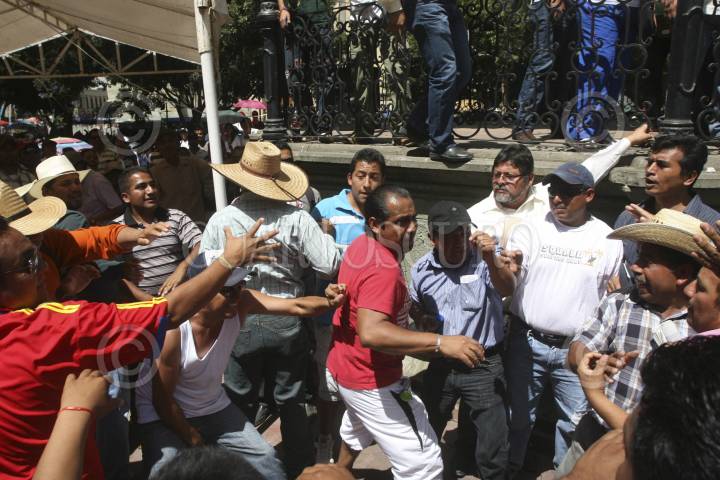 OAXACA, OAXACA, 23MARZO2013.- Maestros del nivel de secundarias técnicas de la Sección 22 del SNTE protestaron al término del mitin que encabezó su dirigente gremial, Rubén Núñez Ginez en el zócalo de la ciudad de Oaxaca, lo anterior ya que no ha resuelto el proceso de elección de dicho nivel, los manifestantes impidieron que el dirigente bajara del kiosko en el que se encontraba por casi 30 minutos, tras lo cual los integrantes de la comisión política comenzaron a descender, momento en el que hubo jaloneos y empujones. FOTO: ARTURO PÉREZ ALFONSO /CUARTOSCURO.COM