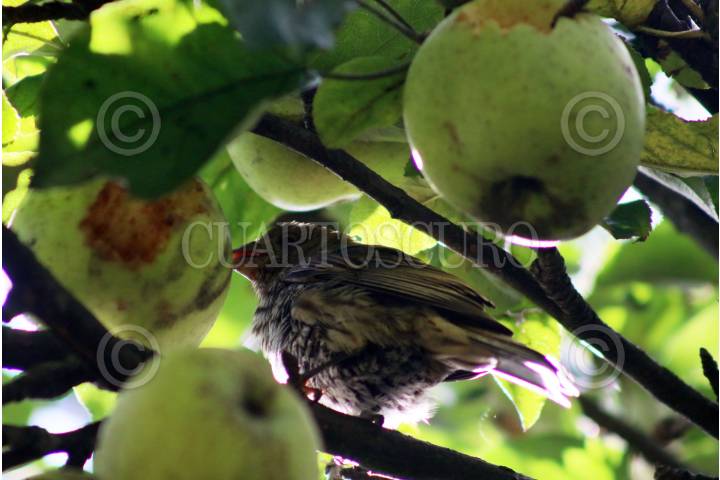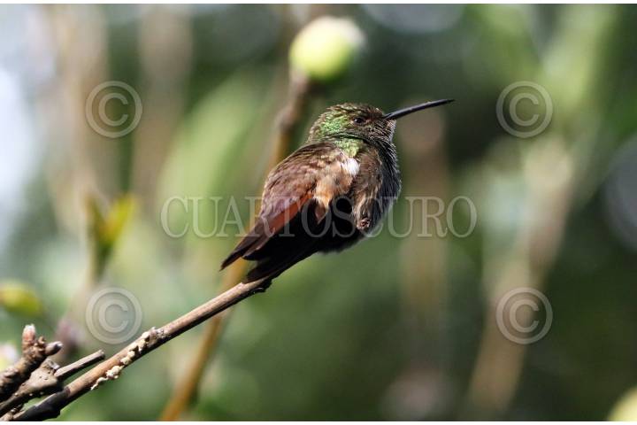 Un colibrí de color verde tornasol se mece en la rama de un manzano en un jardín de Tetela del Volcán.