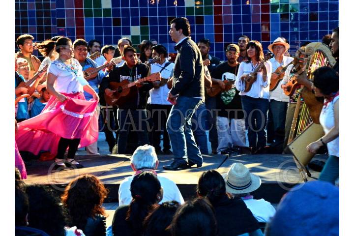 MEXICO, D.F., 26ENERO2014.- El día de hoy se llevó a cabo la clausura del 2º Encuentro de Son Jarocho en el Centro Nacional de las Artes, ubicado en la delegación Coyoacán. En dicho encuentro se reunieron grupos que interpretaron música jarocha para deleite de los asistentes, quienes bailaron con el zapateado tradicional del estado de Veracruz. Al evento acudió gente de todas las edades, algunos ataviados con la vestimenta típica del estado, para disfrutar de la música entre rimas, arpegios y un sol que recordó el clima de donde provienen los sones jarochos. FOTO: DAVID POLO /CUARTOSCURO.COM