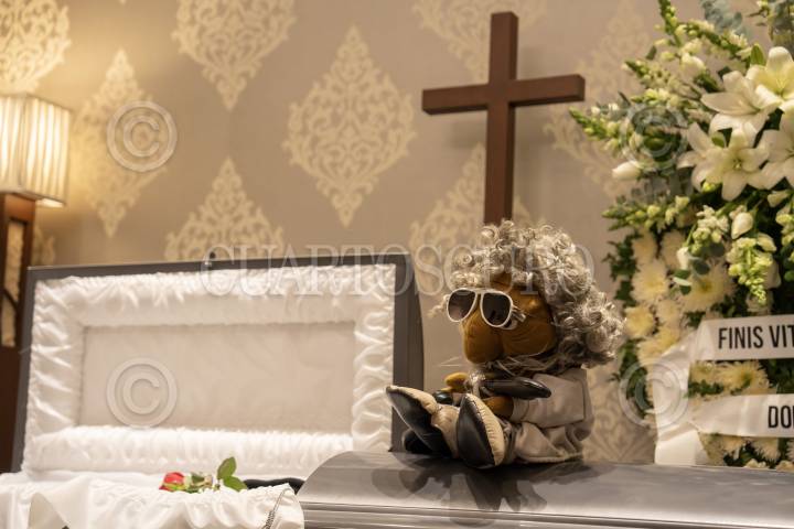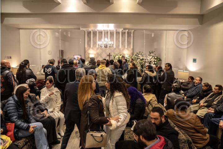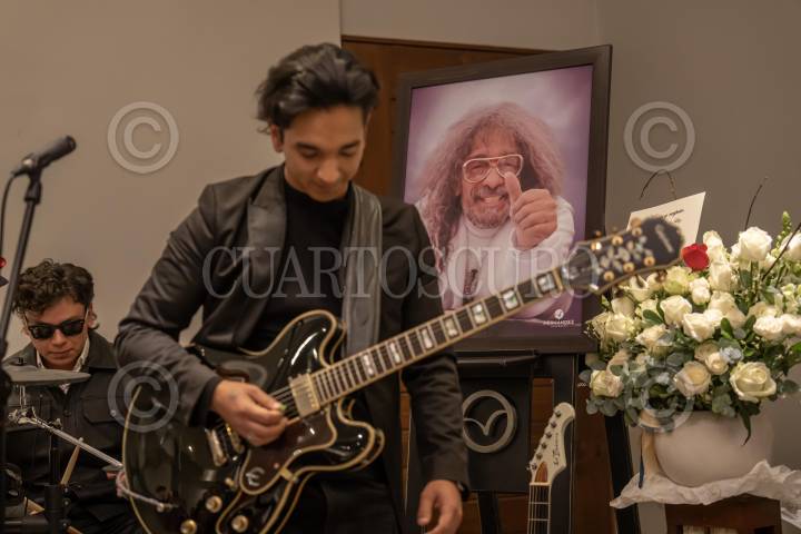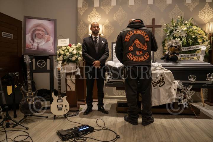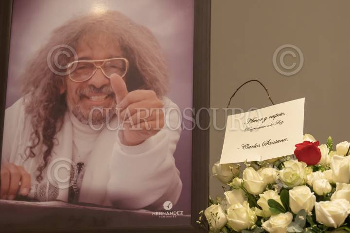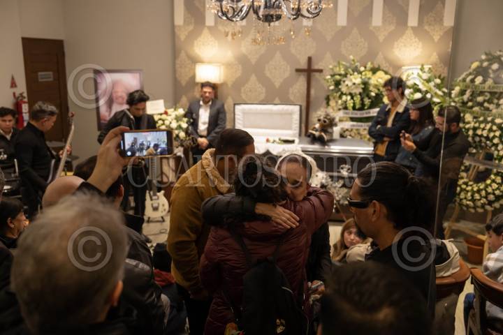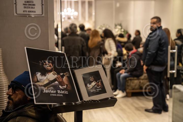 TIJUANA, BAJA CALIFORNIA, 17DIC2024.-Javier Bátiz, el famoso guitarrista tijuanense quien fuera maestro de Carlos Santana, fue velado en la funeraria Hernández, entre flores y amigos. Desde las 6 de la tarde del lunes 16 de diciembre, familiares, amigos y alumnos de Bátiz, comenzaron a llegar para despedirse de él. Guitarras, un muñeco de peluche y una chamarra de mezclilla color blanco con la leyenda “Bátiz, Tijuana” adornaban el ataúd negro con detalles plateados donde se encontraba el cuerpo del icono del rock. Un arreglo floral de rosas blancas destacó entre todos, al colocarse junto a la fotografía del músico, “Amor y respeto, regresamos a la luz”, decía la leyenda del arreglo de Carlos Santana. Los músicos de Bátiz, tocaron canciones de rock a manera de homenaje durante la velada. Bátiz, murió a sus 80 años el pasado sábado 14 de diciembre en su casa mientras dormía, así lo dio a conocer su esposa, Claudia Bátiz, “en sus sueños, bendito sea Dios, me dejó, nos dejó”, expresó. OMAR MARTÍNEZ NOYOLA/ CUARTOSCURO.COM