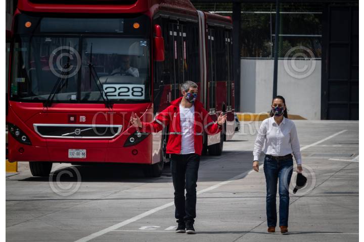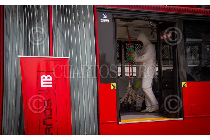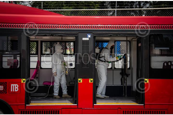 Sanitización en uno de los autobuses de Metrobus previo a su salida al público
