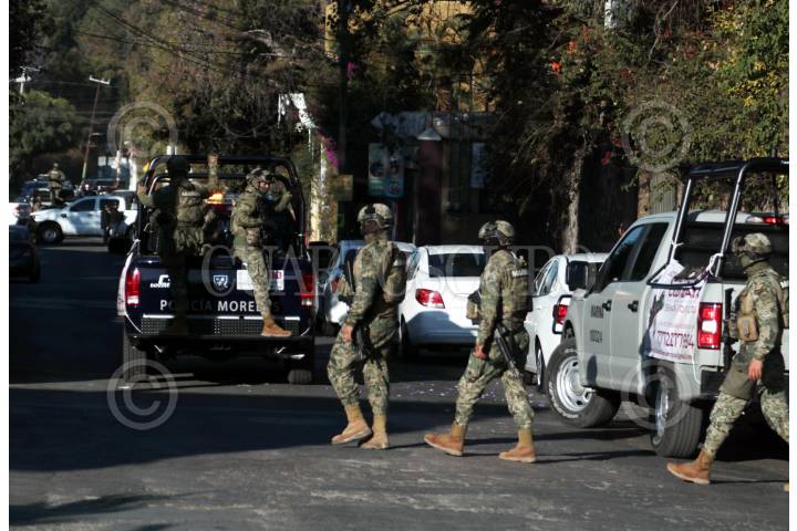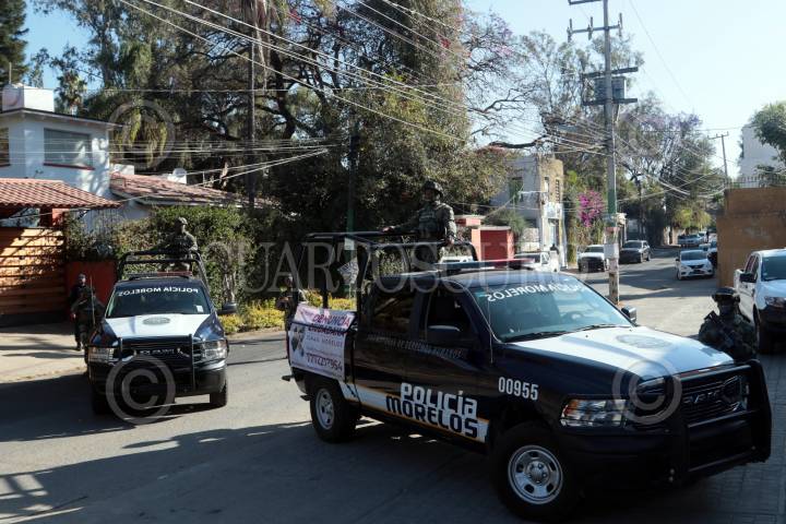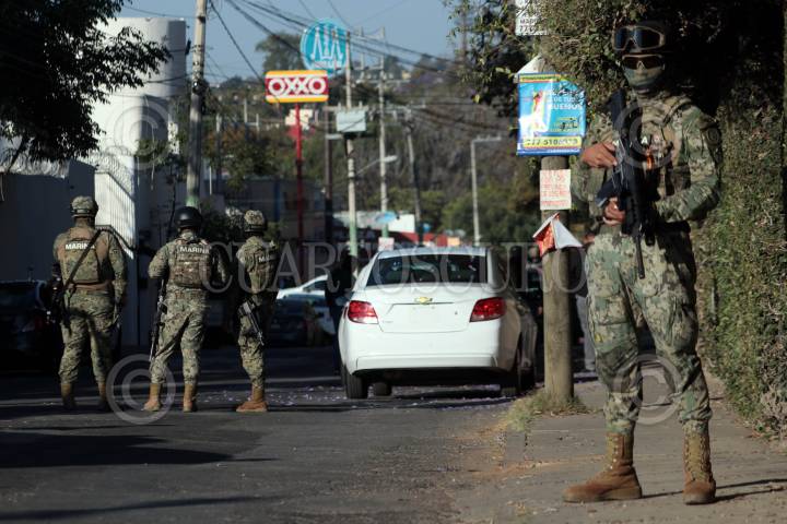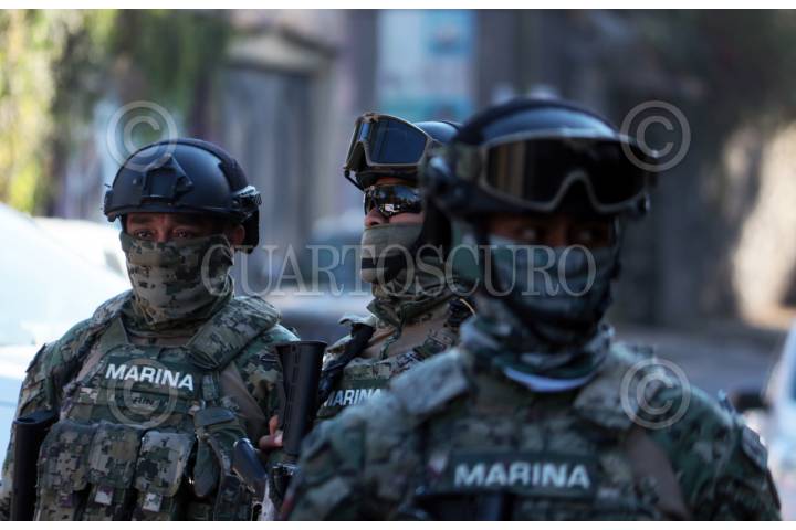 Elementos de la MARINA prestan apoyo en un cateo que realizan agentes de la Fiscalía General de la Republica en una residencia del norte de la capital de Morelos.