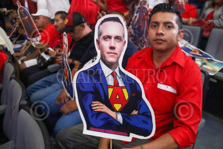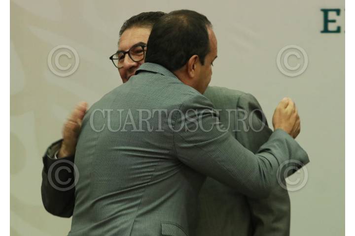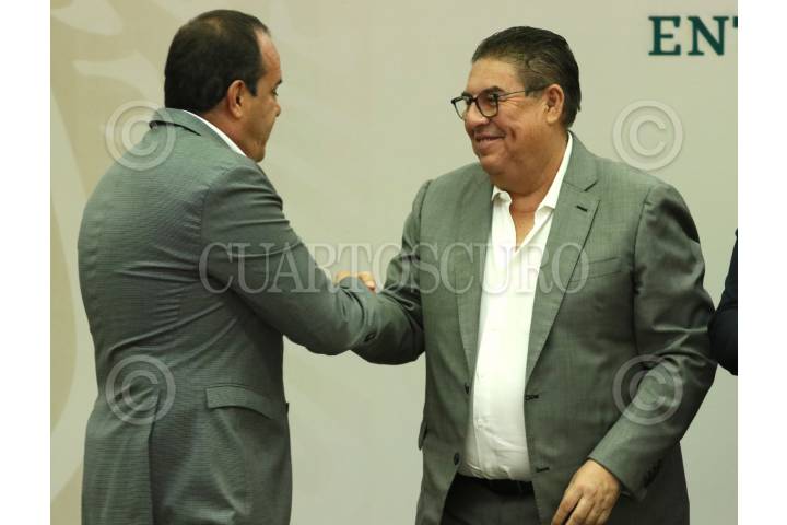 Víctor Mercado Salgado, Coordinador de Asesores de la Oficina de la Gubernatura, durante la Firma de Convenio de Adhesión y Coordinación para la Prestación de Servicios de Salud entre el OPD IMSS-Bienestar y el Estado de Morelos, en el salón Bicentenario del Palacio de Gobierno en Cuernavaca. "El Wero" Mercado se promociona masivamente pretendiendo la candidatura para la gobernatura del Movimiento de Regeneración Nacional.