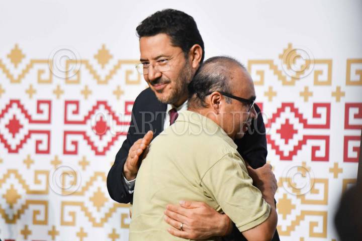 CIUDAD DE MÉXICO, 25SEPTIEMBRE2024.- Martí Batres, jefe de Gobierno, y Leonardo Linares, durante la ceremonia de reconocimiento en el marco de la declaratoria de patrimonio cultural intangible a los alebrijes de Pedro Linares. FOTO: MARIO JASSO/CUARTOSCURO.COM