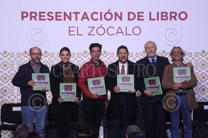 CIUDAD DE MÉXICO, 27SEPTIEMBRE2024. El secretario de Desarrollo Urbano y Vivienda, Inti Muñoz Santini; Daniela Cordero; el encargado de despacho de la Secretaría de Cultura, Argel Gómez Concheiro; el Jefe de Gobierno, Martí Batres Guadarrama y los autores Humberto Musacchio y Nelson Palomo durante la presentación del libro “El Zócalo”, en el Museo de la Ciudad de México. FOTO: EDGAR NEGRETE LIRA/CUARTOSCURO.COM