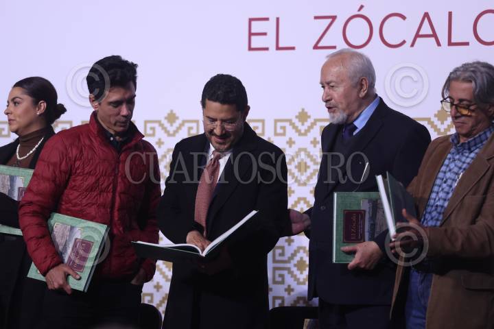CIUDAD DE MÉXICO, 27SEPTIEMBRE2024. El Jefe de Gobierno, Martí Batres Guadarrama, encabezó la presentación del libro “El Zócalo” acompañado del encargado de despacho de la Secretaría de Cultura, Argel Gómez Concheiro; el secretario de Desarrollo Urbano y Vivienda, Inti Muñoz Santini; y los autores Humberto Musacchio y Nelson Palomo, en el Museo de la Ciudad de México. FOTO: EDGAR NEGRETE LIRA/CUARTOSCURO.COM