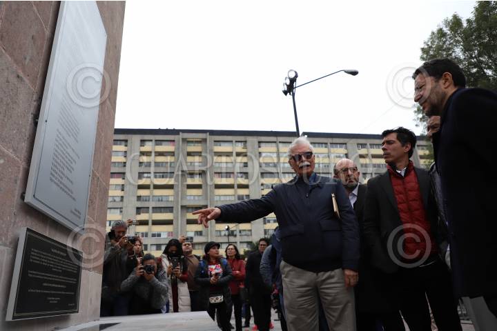 CIUDAD DE MÉXICO, 02OCTUBRE2024.- Félix Hernández Gamundi, líder estudiantil del 68, observa junto a Martí Batres, los trabajos de remodelación de la Estela de Luz en la Plaza de las Tres Culturas. FOTO: DANIEL AUGUSTO/ CUARTOSCURO.COM